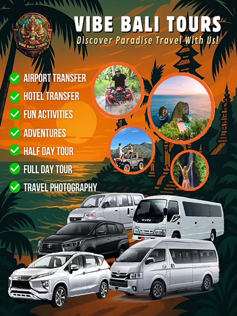 Experience since 2018, we focus on our company about Bali Private Driver and Bali Car Charter. Bali is a small island with its Unique Arts, Culture, beautiful Countryside, and Tradition inside. It is very interesting to learn how it is, Although a little bit difficult, to understand everything. Bali is not enough experienced only once, there are many Things to Do, to learn, and for sure to enjoy. Reviews These made us wonder to show and offer you something different from our Unique Bali Tours. Vibe Bali Tours is an Expert Bali Tour Operator offers Affordable Rates Tour Packages with the which is supported by Hot, Experienced, Friendly, and Helpful Team who always ready to give you the Best Service, Unforgettable Experience, and provide all of your Holiday Needs in this Gorgeous Paradise Island. Bali Private Driver and Bali Car Charter can also create flexible tour itineraries tailored to time and preference specifications. Using fully air-conditioned vehicles for comfort and convenience, our teams are extremely knowledgeable and will help guests experience the real about Bali island.