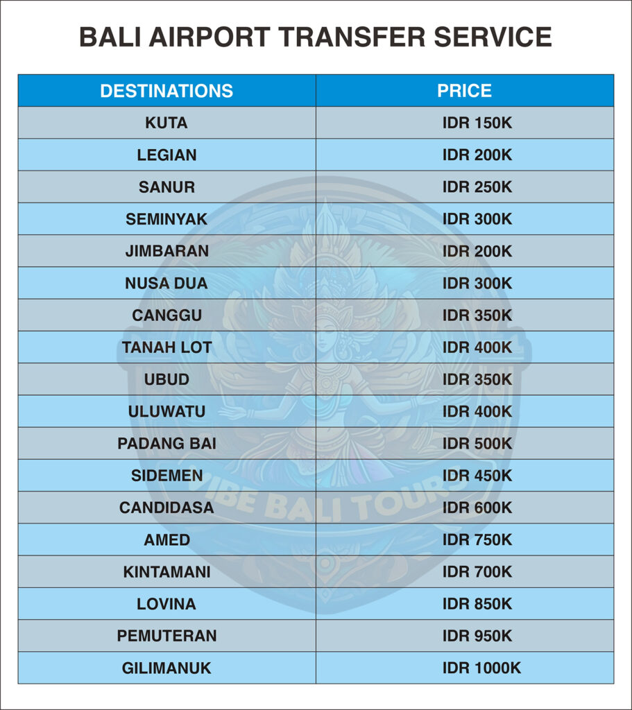 Above prices are applicable for the trip at the main tourist area at south like, Seminyak, Kuta, Legian, Kerobokan, Canggu, Jimbaran, Nusa dua, Sanur and Ubud Other than above mentioned region, like lempuyang, Besakih, Tirta Gangga, Lovina, sekumpul waterfall, munduk, candidasa , amed will be IDR 200K additional cost.